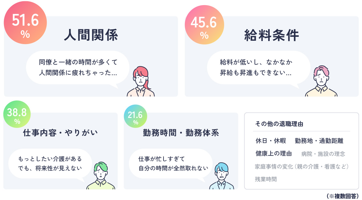 介護職白書2021年度版のアンケート結果では、「人間関係に関する理由」が51.6%と最も多く、次いで「給与条件(年収・月収・手当・賞与など)に関する理由」45.6%、「仕事内容に関する理由」38.8%、「勤務時間・勤務体系(交替制度・オンコール回数など)に関する理由」21.6%となっています。